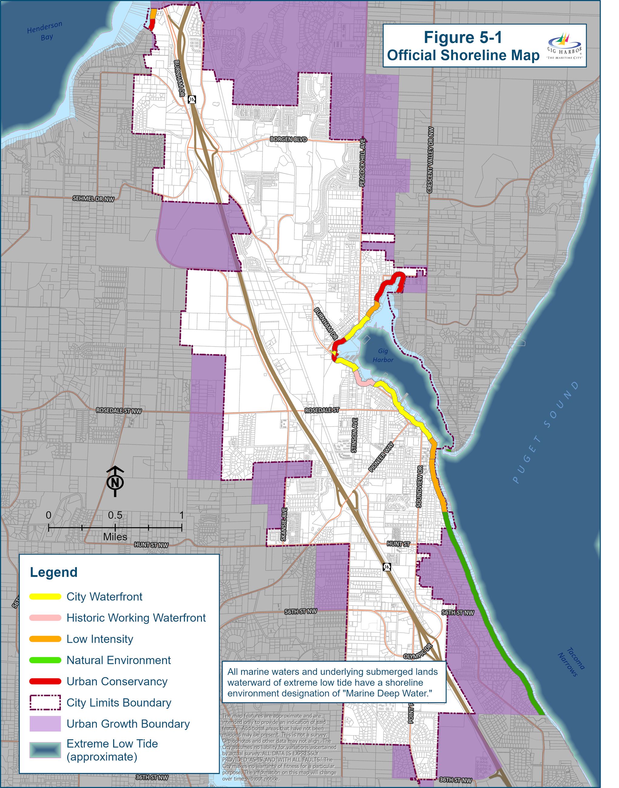 The colored designations in the Shoreline Map represent Shoreline Planning Segments in the Shoreline Master Plan. These regulations impact 5.12 miles of Puget Sound and adjacent shorelands in Gig Harbor including properties on Gig Harbor Bay, the sandpit, Henderson Bay and Burley Lagoon. They do not impact streams or lakes.